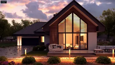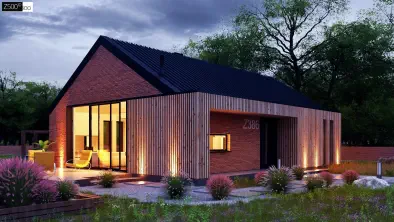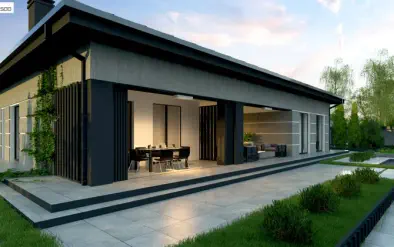 Z509111 m²Cовременный одноэтажный дом с большими окнами и уютной террасой
