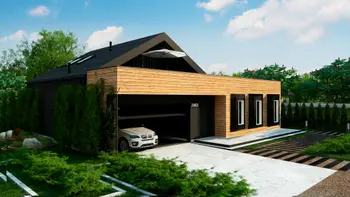 Современный мансардный проект дома с террасой и гаражом на две машины