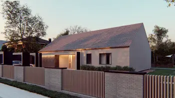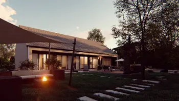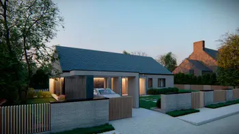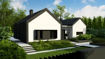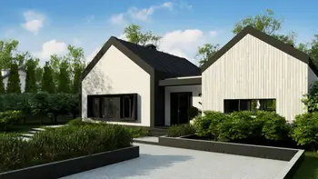 Современный одноэтажный дом с двускатной крышей (электрический котел)