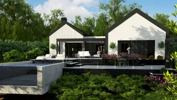 Современный одноэтажный дом с двускатной крышей и большой террасой