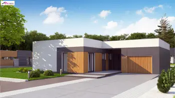 Современный одноэтажный дом с плоской кровлей и гаражом