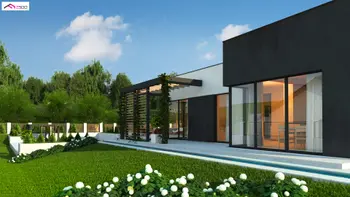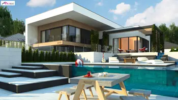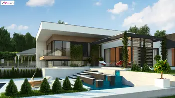 Двоповерховий будинок з пласкою покрівлею та великими площами скління.